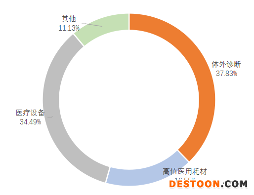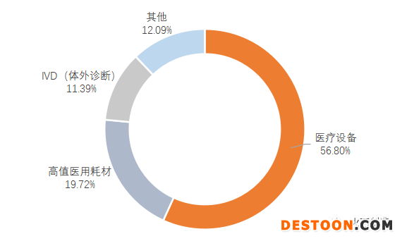 目前,市場上對醫(yī)療器械細分市場劃分沒有統(tǒng)一的標準,本文結(jié)合市場內(nèi)多種劃分標準,將醫(yī)療器械細分市場分為:高值醫(yī)用耗材、IVD(體外診斷)、醫(yī)療設(shè)備及其他。高值醫(yī)用耗材主要相對低值醫(yī)用耗材而言,主要是屬于醫(yī)用??浦委熡貌牧?,如心臟介入、外周血管介入、骨科內(nèi)植介入等醫(yī)用材料;IVD(體外診斷)產(chǎn)業(yè)主要指體外診斷相關(guān)產(chǎn)品,包括體外診斷試劑及體外診斷儀器設(shè)備;醫(yī)療設(shè)備是醫(yī)療、科研、教學、機構(gòu)、臨床學科工作最基本要素,即包括醫(yī)用醫(yī)療設(shè)備,也包括家用醫(yī)療設(shè)備;其他指除高值醫(yī)用耗材、IVD(體外診斷)、醫(yī)療設(shè)備以外的其他醫(yī)療器械。