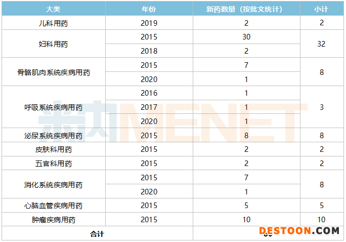 從大類來看,婦科用藥獲批的新藥最多,涉及婦女更年期用藥、乳腺增生藥、婦科炎癥用藥以及婦科調經藥四個亞類,這得益于前幾年國家對婦兒用藥實施了直接掛網采購政策。方盛制藥獲批數量最多,涉及兩個產品,其余30家藥企均獲批了1個新藥。