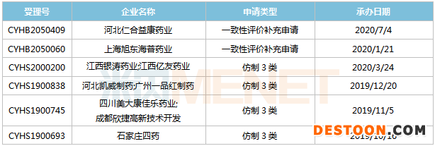 2家企業(yè)提交鹽酸溴己新注射液一致性評(píng)價(jià)補(bǔ)充申請(qǐng),目前仍在審評(píng)審批中;4家企業(yè)以仿制3類提交該產(chǎn)品上市申請(qǐng),其中成都欣捷高新技術(shù)開發(fā)/四川美大康佳樂藥業(yè)的產(chǎn)品獲批生產(chǎn)并視同過評(píng),為國(guó)內(nèi)首家。