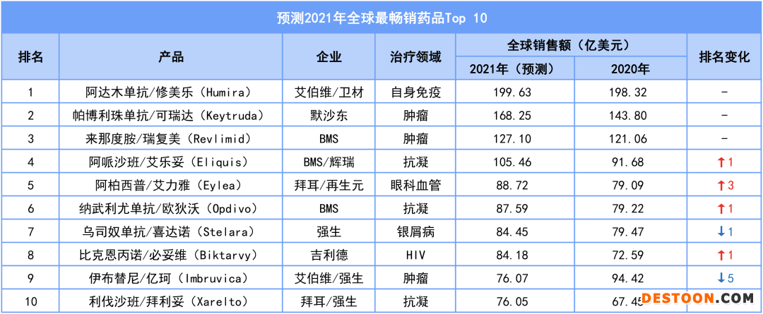 總的來說,相比2020年的銷售數(shù)據(jù)排名,2021年各大品種的預(yù)測排名仍然比較穩(wěn)定,腫瘤仍然是吸金最快的領(lǐng)域。