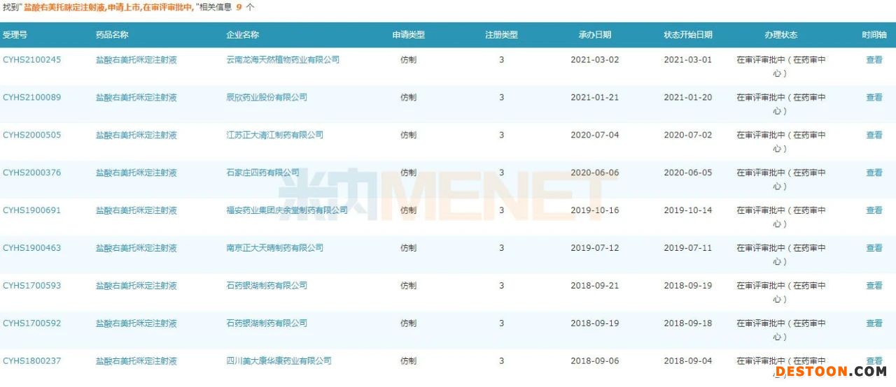 截至目前,鹽酸右美托咪定注射液已有南京正大天晴制藥、石藥銀湖制藥、江蘇正大清江制藥等8家企業(yè)以仿制3類提交上市申請在審評審批中(在藥審中心);鹽酸右美托咪定氯化鈉注射液有揚子江藥業(yè)集團、湖南科倫制藥、成都倍特藥業(yè)以仿制3類提交上市申請在審評審批中(在藥審中心)。