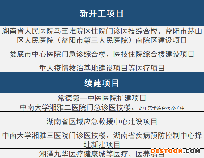 2021年湖南省重點(diǎn)建設(shè)項(xiàng)目已公布,其中醫(yī)療相關(guān)新開(kāi)工項(xiàng)目以及續(xù)建項(xiàng)目包含:
