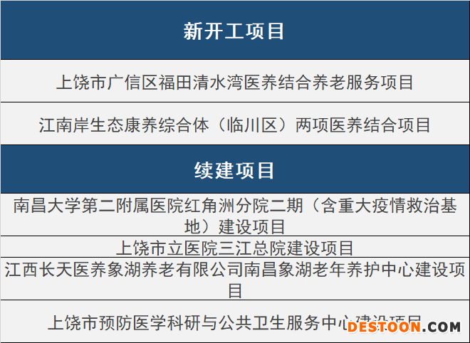 續(xù)建項(xiàng)目里含醫(yī)療衛(wèi)生項(xiàng)目11項(xiàng)、醫(yī)養(yǎng)結(jié)合項(xiàng)目2項(xiàng),分別是: