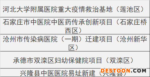 根據(jù)《河北省2021年省重點(diǎn)建設(shè)項(xiàng)目名單》,共安排省重點(diǎn)項(xiàng)目682項(xiàng),總投資11896.5億元,年度預(yù)計(jì)投資2810.6億元其中,新開(kāi)工項(xiàng)目中含醫(yī)療衛(wèi)生項(xiàng)目5項(xiàng),分別是: