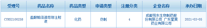 3月10日訊 日前,CDE官網(wǎng)顯示,成都苑東生物制藥|廣東星昊藥業(yè)的鹽酸帕洛諾司瓊注射液以仿制4類報產(chǎn)獲受理,獲批后將視同過評。不久前,齊魯制藥(海南)的鹽酸帕洛諾司瓊注射液和遼寧海思科制藥的鹽酸帕洛諾司瓊注射液均以補(bǔ)充申請獲批過評。米內(nèi)網(wǎng)數(shù)據(jù)顯示,2019年中國公立醫(yī)療機(jī)構(gòu)終端帕洛諾司瓊注射劑銷售額超過10億元,生產(chǎn)廠家有齊魯制藥(海南)、正大天晴藥業(yè)集團(tuán)、揚子江四川海蓉藥業(yè)、江蘇恒瑞醫(yī)藥等15家,其中,齊魯制藥(海南)的市場份額最大。