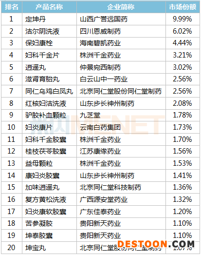 2020E重點城市實體藥店婦科中成藥產(chǎn)品TOP20