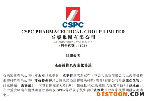 石藥集團(tuán)日前發(fā)布公告,公司全資附屬公司上海津曼特生物科技有限公司與康諾亞生物醫(yī)藥科技(成都)有限公司(簡稱“康諾亞生物”)訂立協(xié)議,內(nèi)容是關(guān)于產(chǎn)品CM310在中重度哮喘和慢性阻塞性肺?。–OPD)等呼吸系統(tǒng)疾病的獨(dú)家授權(quán)開發(fā)及商業(yè)化。