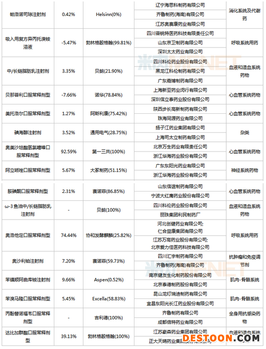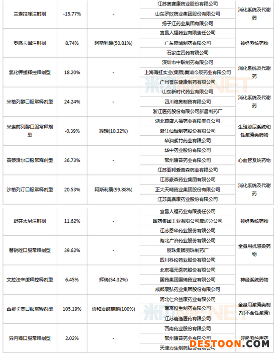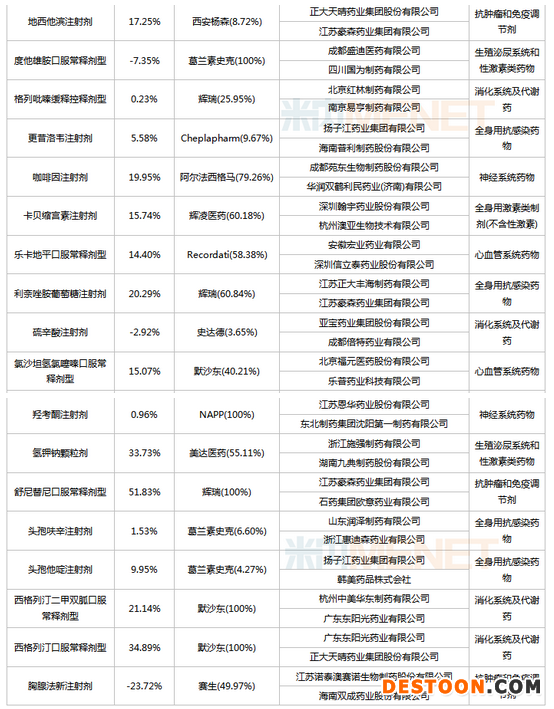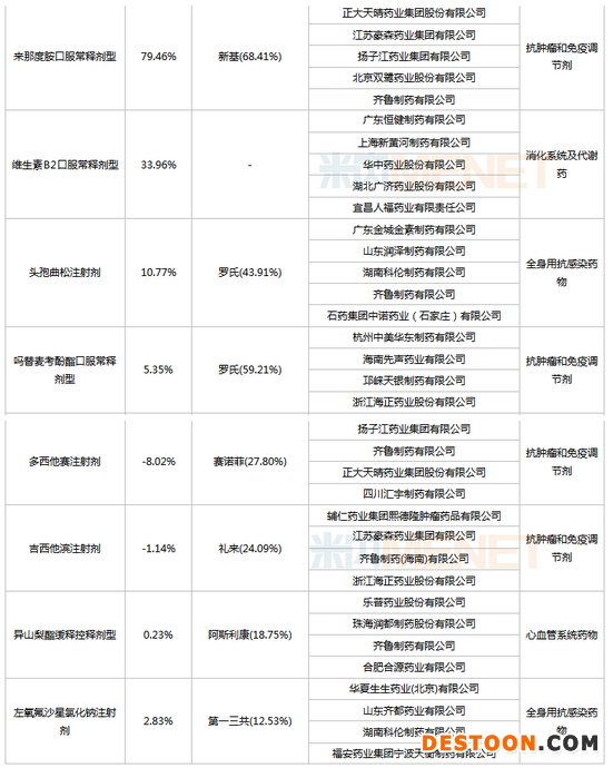 此外,賽諾菲涉及3個原研藥品——多西他賽注射劑、奧沙利鉑注射劑、胺碘酮口服常釋劑型;羅氏涉及兩個原研藥品——頭孢曲松注射劑、嗎替麥考酚酯口服常釋劑型;默沙東涉及3個原研藥品——氯沙坦氫氯噻嗪口服常釋劑型、西格列汀二甲雙胍口服常釋劑型、西格列汀口服常釋劑型;葛蘭素史克涉及3個原研藥品——拉米夫定口服常釋劑型、頭孢呋辛注射劑、頭孢他啶注射劑。