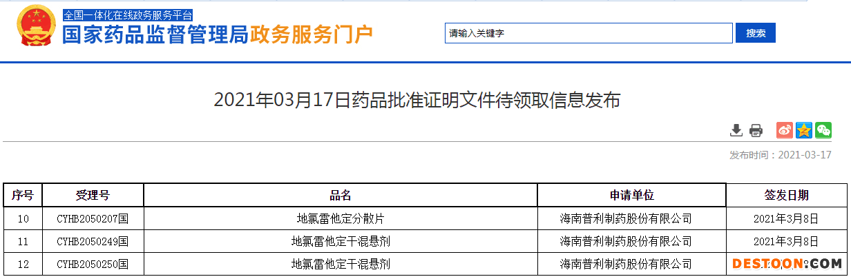 3月18日訊 3月17日,NMPA官網(wǎng)顯示,普利制藥的地氯雷他定分散片、地氯雷他定干混懸劑通過一致性評價。地氯雷他定是臨床一線抗過敏藥物,普利制藥該產品分散片、干混懸劑為獨家劑型。米內網(wǎng)數(shù)據(jù)顯示,2019年中國公立醫(yī)療機構終端地氯雷他定銷售額接近6億元。