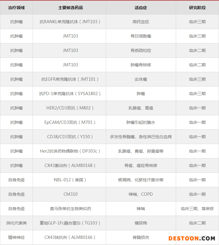 40余項在研大分子創(chuàng)新藥中,16項處于臨床研究階段,其中5項注冊臨床,20余項處于臨床前研究階段??筊ANKL單克隆抗體(JMT103)、抗EGFR單克隆抗體(JMT101)、抗PD-1單克隆抗體(SYSA1802)、奧馬珠單抗生物類似藥等均處于III期臨床研究階段,JMT103預計將于2022-2023年上市。