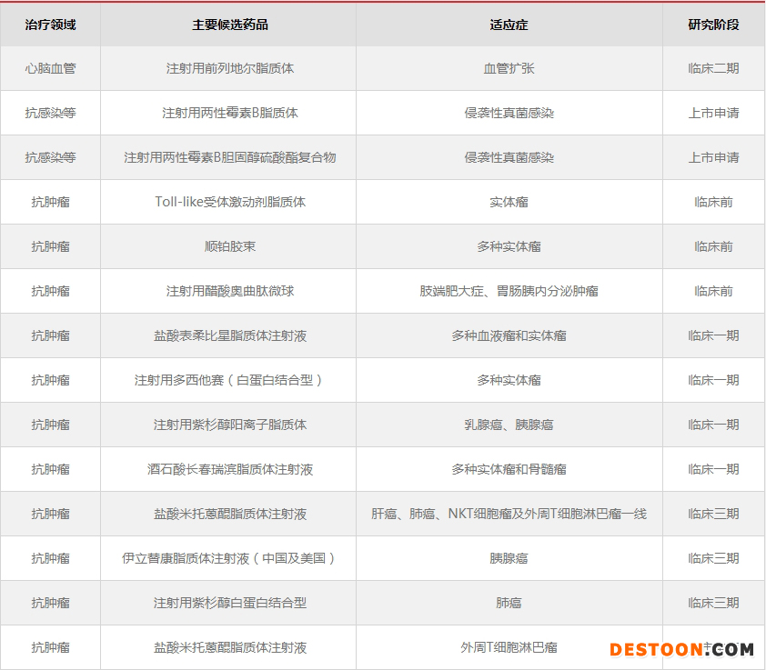 20余項在研新型制劑中,3項待批準生產(chǎn),10項正在進行臨床研究,10余項處于臨床前研究階段。其中,兩性霉素B脂質(zhì)體已提交上市申請,伊立替康脂質(zhì)體將于近期提交上市申請。兩性霉素B納米復合物、米托蒽醌脂質(zhì)體已報NDA并獲得優(yōu)先審評,預計今年獲批上市。