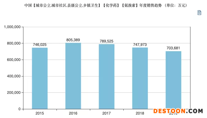 近年來,氨溴索的銷售額有所下滑,不過降幅不大,相對(duì)穩(wěn)定,依舊保持在一個(gè)較高的水平。米內(nèi)網(wǎng)數(shù)據(jù)顯示,2019年中國公立醫(yī)療機(jī)構(gòu)終端氨溴索銷售額超過70億元。