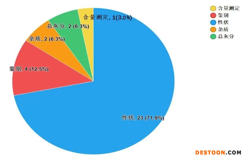 不符合規(guī)定項(xiàng)目包括性狀、檢查和含量測定,不符合規(guī)定產(chǎn)品數(shù)量依次為1、42和1批次,分別占全部不符合規(guī)定項(xiàng)目的2.3%、95.4%和2.3%(見圖6)。