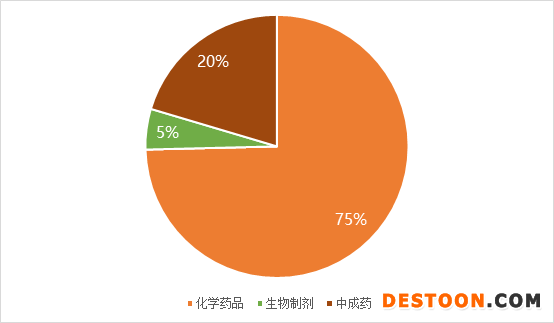 2020年上海市醫(yī)院藥品銷售市場化學(xué)藥品占比達(dá)75%,中成藥和生物制劑占比位列二、三,占比分別為20%和5%。