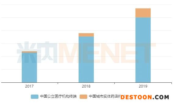 原研產(chǎn)品在醫(yī)保的推動下,在中國城市公立醫(yī)院、縣級公立醫(yī)院、城市社區(qū)中心及鄉(xiāng)鎮(zhèn)衛(wèi)生院(簡稱中國公立醫(yī)療機構(gòu))終端的銷售額節(jié)節(jié)攀升,而在中國城市實體藥店終端的銷售額更是以驚人的速度在上升,2018-2019年增速均超過100%,該產(chǎn)品2019年合計銷售額超過28億元,2020年有望突破30億元關(guān)口。