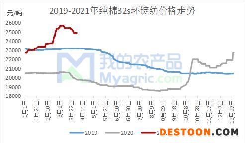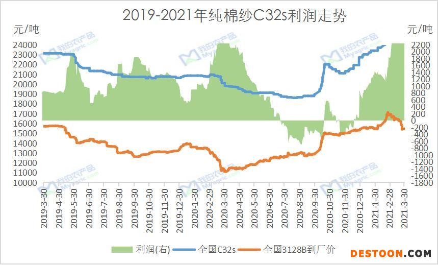 據(jù)我的農(nóng)產(chǎn)品跟蹤數(shù)據(jù),截止3月30日,全國(guó)環(huán)錠紡32s純棉紗環(huán)錠紡的紡紗利潤(rùn)為2881.9元/噸,連續(xù)八個(gè)工作日維持在2500元/噸以上的水平,部分紗廠高支紗利潤(rùn)達(dá)5000元/噸,多數(shù)紗企表示今年紡織市場(chǎng)經(jīng)歷近幾年的好行情。紡織即期利潤(rùn)之所以如此可觀原因有二:一是紡企目前在紡訂單多為節(jié)后預(yù)售訂單,且當(dāng)時(shí)紗價(jià)處于較高位置;二是紡企原料庫(kù)存充裕,多在1.5個(gè)月以上,部分紗企在4到5個(gè)月,且多為逢低采購(gòu),原料成本相對(duì)較低。