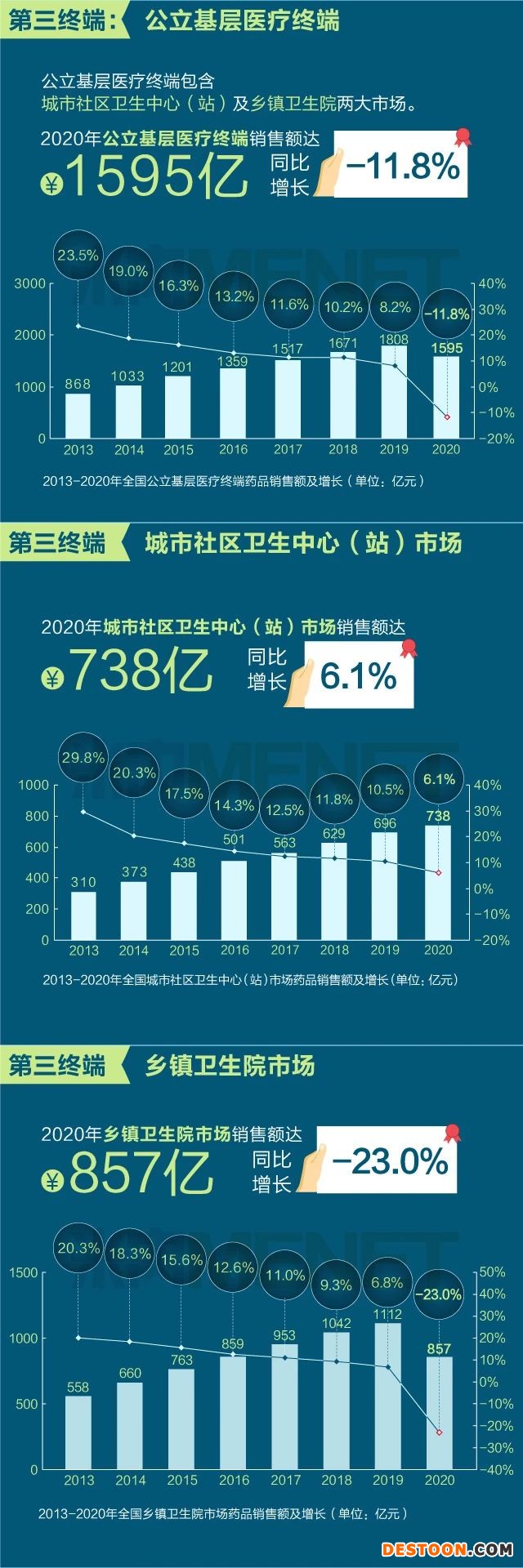 銷售額達(dá)16437億元,同比負(fù)增長8.5%。從實(shí)現(xiàn)藥品銷售的三大終端的銷售額分布來看,公立