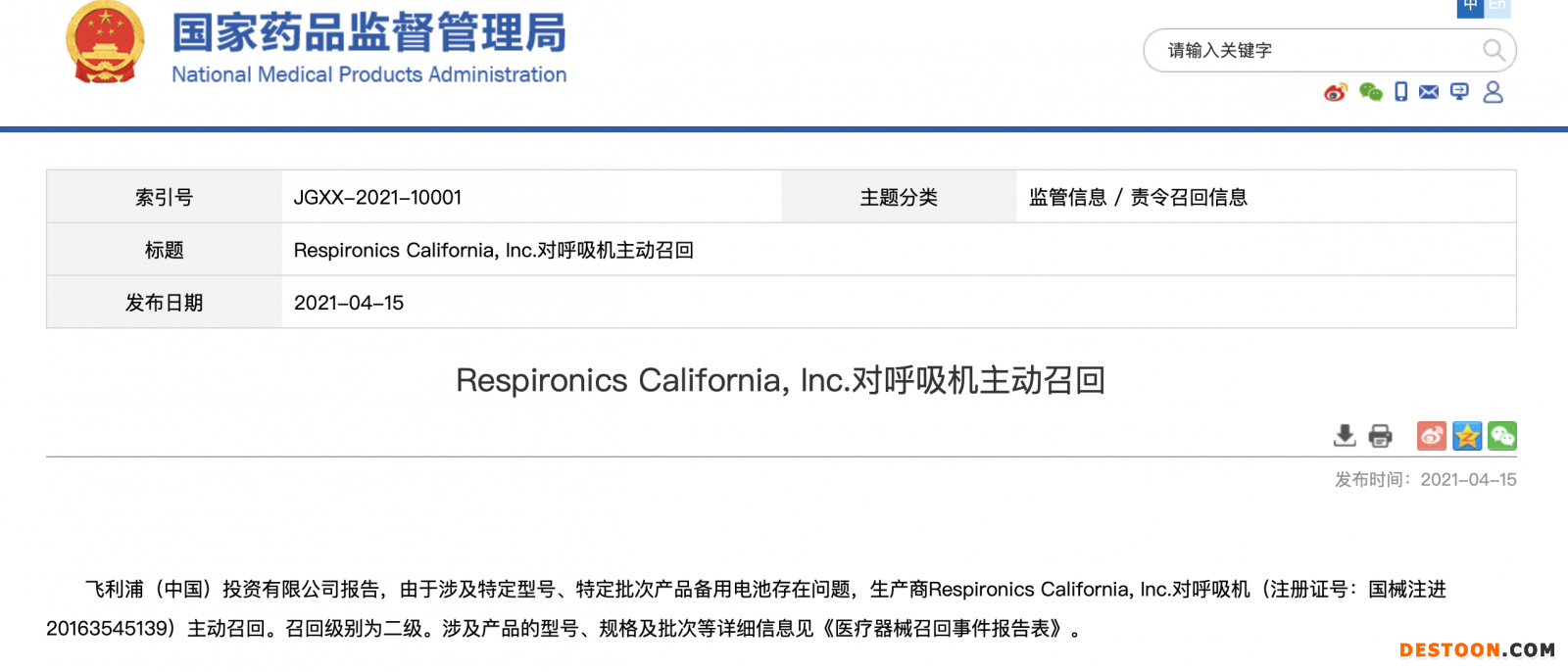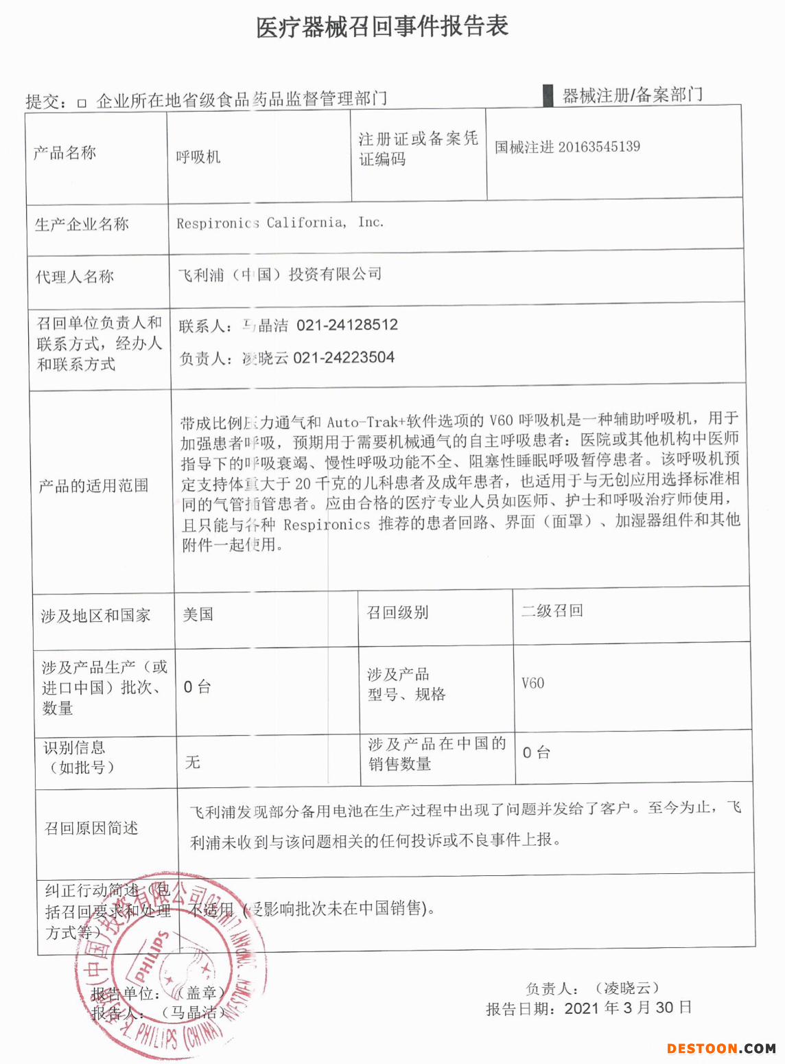 4月15日,飛利浦(中國)投資有限公司報告,由于涉及特定型號、特定批次產(chǎn)品備用電池存在問題,生產(chǎn)商Respironics California, Inc.對呼吸機(注冊證號:國械注進(jìn)20163545139)主動召回。召回級別為二級。涉及產(chǎn)品的型號、規(guī)格及批次等詳細(xì)信息見《醫(yī)療器械召回事件報告表》。