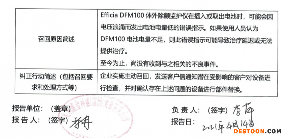 飛利浦金科威(深圳)實業(yè)有限公司發(fā)現(xiàn)Efficia DFM100體外除顫儀在插入或取出電池時,可能會因為電壓浪涌而發(fā)出電池電量低的錯誤指示,此錯誤指示可能導(dǎo)致治療延遲或無法提供治療,因此飛利浦金科威(深圳)實業(yè)有限公司決定發(fā)起主動召回。飛利浦金科威(深圳)實業(yè)有限公司對其生產(chǎn)的體外除顫監(jiān)護(hù)儀(注冊證號:國械注準(zhǔn)20183080392)主動召回。召回級別為二級 。