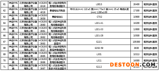從文件中可以看到,此次共計(jì)8大類(lèi)品種,涉及71個(gè)醫(yī)用耗材入圍備案,其中包括微創(chuàng)神通醫(yī)療科技(上海)有限公司的神經(jīng)血管導(dǎo)絲、強(qiáng)生(上海)醫(yī)療器材有限公司的彈簧圈 Codman Microcoil Delivery System、北京品馳醫(yī)療設(shè)備有限公司的植入式骶神經(jīng)刺激器套件等。