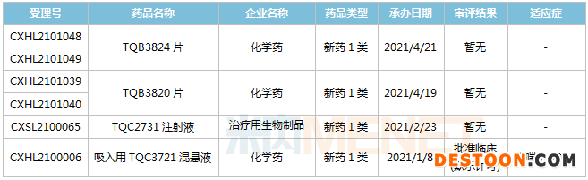 4月21日,正大天晴藥業(yè)以新藥1類提交的TQB3824片臨床申請獲得CDE承辦受理,受理號為CXHL2101048、CXHL2101049;4月19日,正大天晴藥業(yè)另一款新藥1類TQB3820片申請臨床,受理號為CXHL2101039、CXHL2101040。2021年至今,正大天晴藥業(yè)已有4款1類新藥申報臨床,其中1款已獲批臨床,為吸入劑。