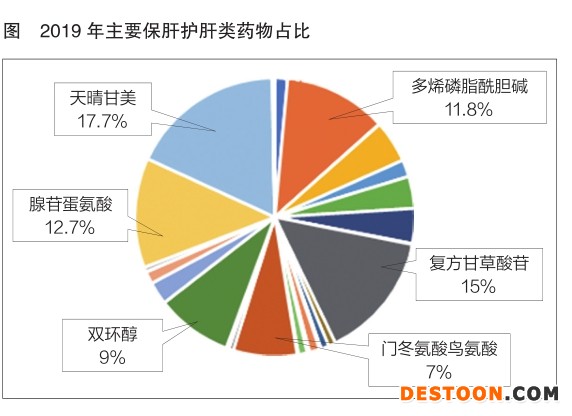 多烯磷脂酰膽堿也是肝保護(hù)類藥物市場(chǎng)上非常重要的產(chǎn)品,其通過直接影響膜結(jié)構(gòu),使受損的肝功能和酶活力恢復(fù)正常,調(diào)節(jié)肝臟的能量平衡,促進(jìn)肝細(xì)胞再生;將中性脂肪和膽固醇轉(zhuǎn)化成容易代謝的形式;穩(wěn)定膽汁。2019年,多烯磷脂酰膽堿的總銷售額為5.2億元,其中3.3億元由成都天臺(tái)山制藥創(chuàng)造,賽諾菲生產(chǎn)的“易善復(fù)”銷售額為1.38億元。成都天臺(tái)山生產(chǎn)的多烯磷脂酰膽堿在過去10年中市場(chǎng)占比最大,2018年以來(lái)銷售額有所下降,但仍遠(yuǎn)高于易善復(fù)。