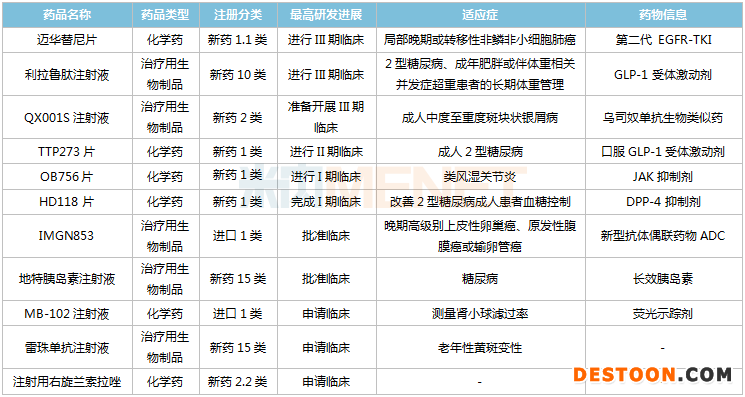 6款1類新藥中,邁華替尼為第二代EGFR-TKI靶向藥,目前正在開展局部晚期或轉(zhuǎn)移性非鱗非小細胞肺癌的III期臨床,公司爭取以一/二線罕見基因突變的II期單臂臨床試驗結(jié)果直接申報上市;口服GLP-1受體激動劑TTP273片正在開展II期臨床,用于治療成人2型糖尿??;JAK抑制劑OB756片正在開展I期臨床,用于治療類風濕關(guān)節(jié)炎;引進的IMGN853是一款新型抗體偶聯(lián)藥物ADC,以百日速度完成臨床申報工作,目前已獲批臨床,MB-102注射液為全球首創(chuàng)腎功能監(jiān)測產(chǎn)品。