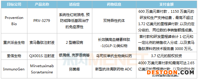 Mirvetuximab Soravtansine是全球首個針對葉酸受體α(FRα)陽性卵巢癌的ADC候選藥物,正在美國開展III期臨床;PRV-3279是一種針對B細胞表面蛋白CD32B和CD79B的人源化雙抗,系統(tǒng)性紅斑狼瘡適應(yīng)癥正在美國開展I期臨床;索馬魯肽注射液是一款生物類似藥,諾和諾德的產(chǎn)品2020年全球銷售額超過30億美元;QX001S注射液為烏司奴單抗生物類似藥。