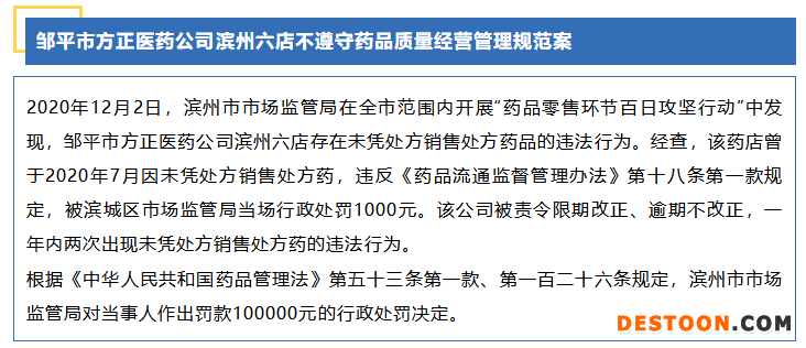 案例顯示,2020年12月2日,濱州市市場監(jiān)管局在全市范圍內(nèi)開展“藥品零售環(huán)節(jié)百日攻堅行動”中發(fā)現(xiàn),鄒平市方正醫(yī)藥公司濱州六店存在未憑處方銷售處方藥品的違法行為。