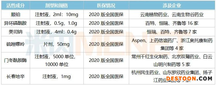 米內(nèi)網(wǎng)數(shù)據(jù)顯示,上述6個抗腫瘤藥均為2020版全國醫(yī)保目錄品種,恒瑞、齊魯、雙鷺藥業(yè)、白云山、揚子江等國內(nèi)巨頭均有布局。