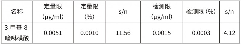 結(jié)論:3-甲基-8-喹啉磺酸定量限小于報(bào)告限度(0.05%)的50%,檢測限小于定量限的0.5倍,方法靈敏度符合要求。