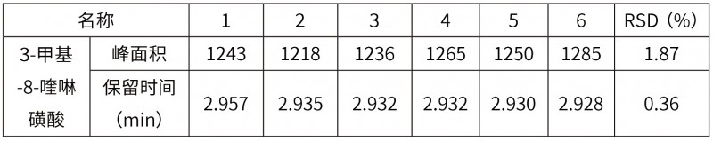 對照品溶液中3-甲基-8-喹啉磺酸各色譜參數(shù)符合要求,空白溶劑不干擾3-甲基-8-喹啉磺酸檢測,專屬性良好。