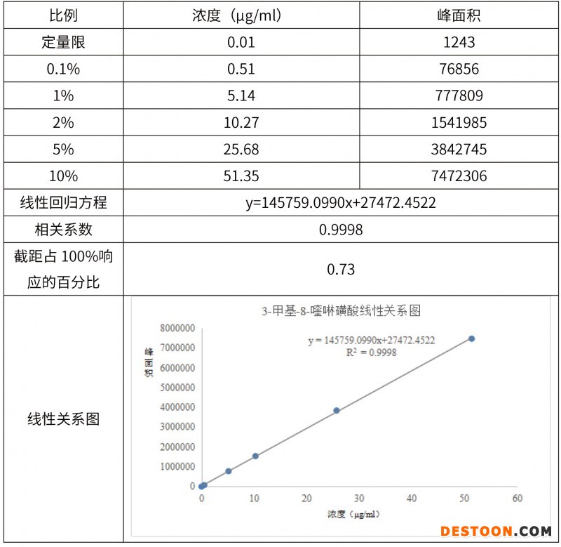 結(jié)論:3-甲基-8-喹啉磺酸在0.01~51.35μg/ml濃度范圍內(nèi),R2>0.999,濃度與峰面積之間線性關(guān)系良好。
