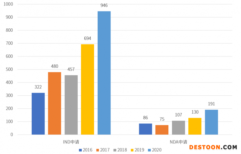 2016-2020 國(guó)內(nèi)創(chuàng)新藥IND、NDA申請(qǐng)數(shù)量