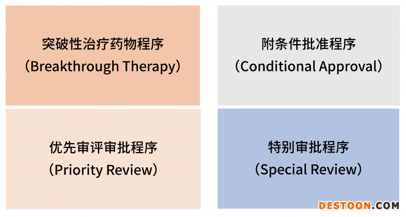 特別明確的支持以臨床價(jià)值為導(dǎo)向的藥物創(chuàng)新,為鼓勵(lì)真正的創(chuàng)新, 針對(duì)不同的申報(bào)階段給與相應(yīng)的政策和技術(shù)支持,例如技術(shù)指導(dǎo)、溝通交流,優(yōu)先配置資源,縮短審評(píng)時(shí)限,溝通交流后補(bǔ)充提交技術(shù)資料等,制定了4種給予政策優(yōu)惠的藥品審評(píng)審批程序: