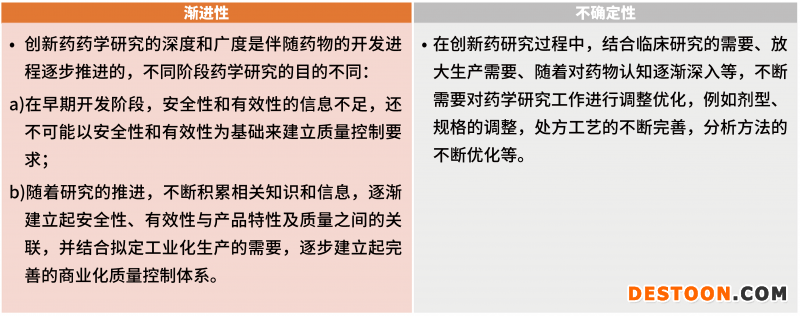 創(chuàng)新藥的藥學(xué)研發(fā)呈現(xiàn)不同于仿制藥的特有規(guī)律和研究特點(diǎn),具體可歸納為漸進(jìn)性、不確定性。