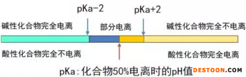 流動相pH值一般選取pKa±2范圍之外,以保障化合物處于分子狀態(tài),減少電離,此狀態(tài)下化合物疏水性較強(qiáng),色譜柱保留時間較長,能獲得良好的峰型。