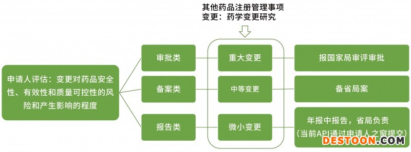 依據(jù)變更對藥品安全性、有效性、質(zhì)量可控性的影響,將藥學(xué)變更分為微小變更、中等變更和重大變更,由申請人依據(jù)對產(chǎn)品的理解進(jìn)行評估及相應(yīng)的研究、申報(bào)工作。
