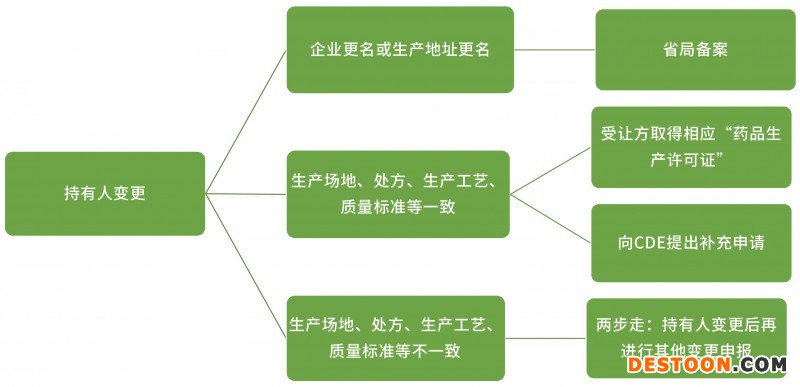 除以上變更外,《藥品上市后變更管理辦法(試行)》及《已上市化學(xué)藥品藥學(xué)變更研究技術(shù)指導(dǎo)原則(試行)》對持有人及生產(chǎn)場地的變更流程及研究內(nèi)容進(jìn)行了明確的規(guī)定。