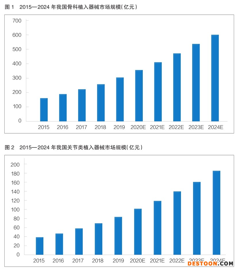 雖然我國骨科植入器械行業(yè)仍處于初級階段,但隨著人口老齡化程度的加深,以及人均醫(yī)療保健消費支出的增長,骨科植入器械市場整體規(guī)模增長迅速。根據(jù)米內網(wǎng)、廣州標點醫(yī)藥信息股份有限公司(以下簡稱標點信息)發(fā)布的數(shù)據(jù),該領域市場銷售收入已由2015年的164億元增長至2019年的308億元,年復合增長率為17.03%,高于全球骨科植入器械市場的整體增長速度;預計到2024年,我國骨科植入器械市場規(guī)模將達到607億元(詳見圖1)。我國骨科植入器械行業(yè)具有較大的市場發(fā)展空間,將繼續(xù)保持快速增長的態(tài)勢。