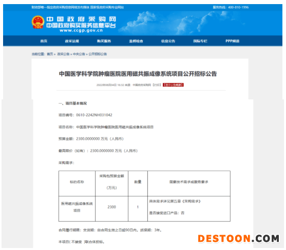 中國政府采購網(wǎng)日前發(fā)布《中國醫(yī)學(xué)科學(xué)院腫瘤醫(yī)院醫(yī)用磁共振成像系統(tǒng)項目公開招標(biāo)公告》(下稱《公告》),中國醫(yī)學(xué)科學(xué)院腫瘤醫(yī)院準(zhǔn)備以2300萬采購醫(yī)用磁共振成像系統(tǒng),并明確表示“不接受進口產(chǎn)品”。
