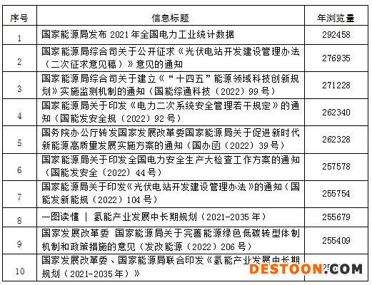 2022年,國家能源局門戶網(wǎng)站訪問量222,270,789次,訪客數(shù)44,625,286人。從閱讀排行看,關(guān)注度最高的3篇信息為《國家能源局發(fā)布2021年全國電力工業(yè)統(tǒng)計數(shù)據(jù)》《國家能源局綜合司關(guān)于公開征求<光伏電站開發(fā)建設(shè)管理辦法(二次征求意見稿)>意見的通知》《國家能源局綜合司關(guān)于建立<“十四五”能源領(lǐng)域科技創(chuàng)新規(guī)劃>實(shí)施監(jiān)測機(jī)制的通知》(國能綜通科技〔2022〕99號),年瀏覽量分別為292458、276935和271228,詳見下表。從站內(nèi)搜索看,“能源規(guī)劃”“新能源”“風(fēng)電”“輸配電”“特高壓”等成為高頻詞匯。